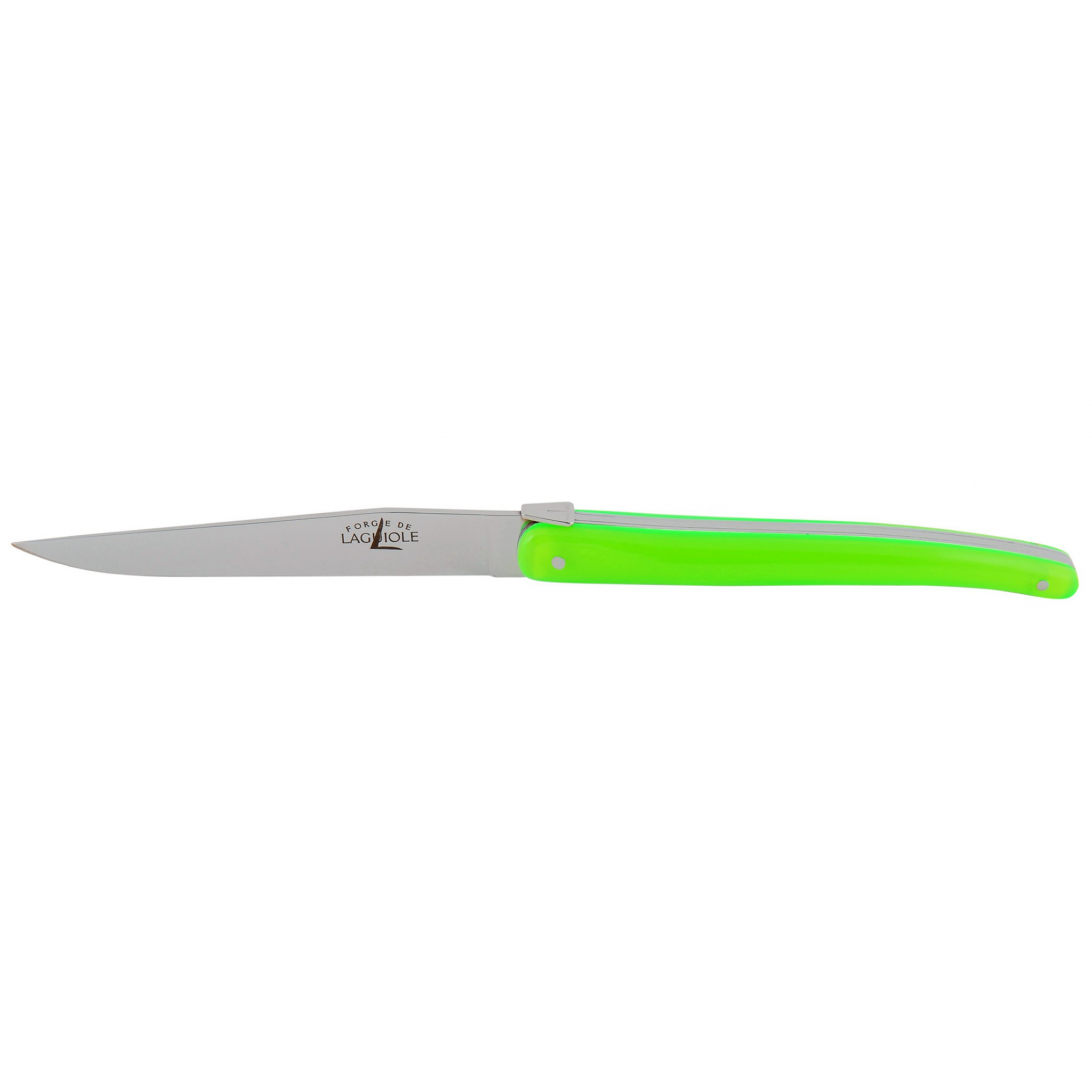 Coffret de 2 ou 6 couteaux Fluo de table Laguiole plein manche en Dacryl® (matière française) qui satisfait aux critères qualitatifs les plus stricts. Design Jean-Michel Wilmotte