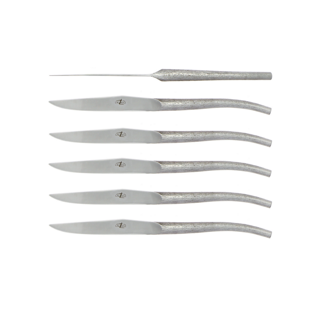 6 couteaux de table Laguiole, plein manche en inox, finition satinée effet écorce de bois.